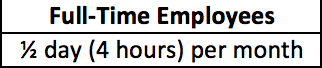 In addition to the days offered and accrued under the holiday and vacation policy sections, full-time employees accrue six (6) personal/sick days to use as they wish. Employees cannot use more sick/personal leave than has been accrued. Employees will not be paid for sick/personal leave accrued but not taken upon resignation or termination of their employment with the Company. Full-time employees accrue sick time at the rate of ½ day per month. Employees working less than 30 hours each week and temporary employees do not receive sick leave compensation. Sick/Personal leave balances will not roll over from year to year.